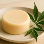 A conditioning lotion bar with cannabis leaves on a saucer.
